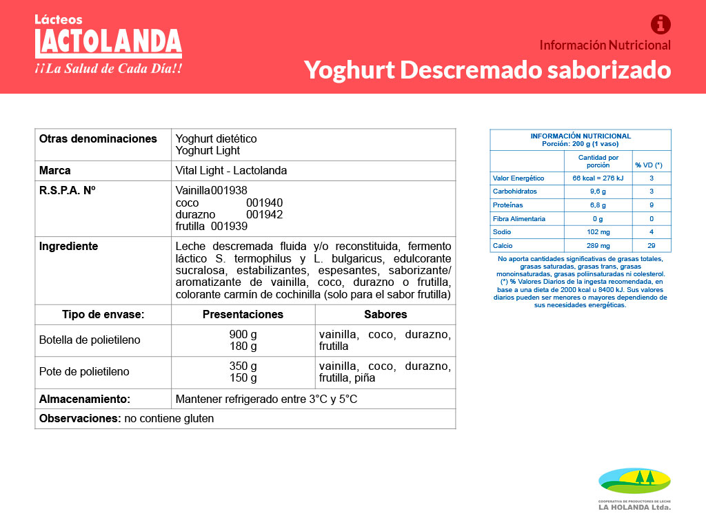 El yoghurt Vital Light es un alimento descremado con bajo contenido de calorías, no contiene grasas ni colesterol; ayuda a proteger y regular la flora intestinal, aporta la misma cantidad de proteínas de alta calidad y calcio que el yogurt entero.
